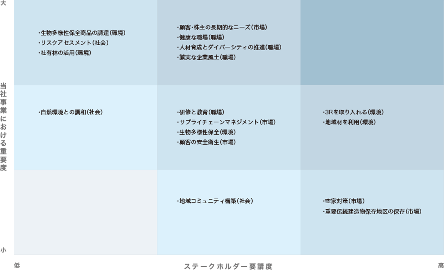 ステークホルダーの要請度と当社事業における重要度の2軸でマッピングと分類を行いました。